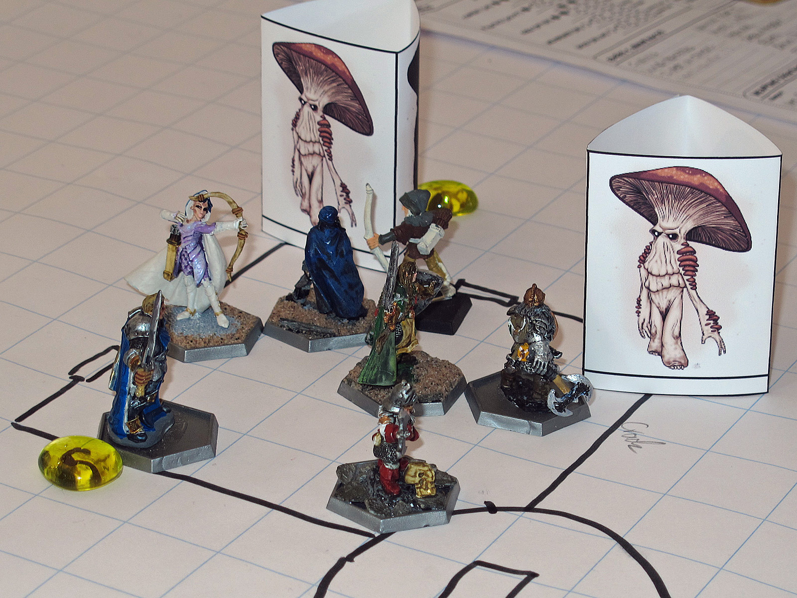 The markers in action. Here one of the myconids and a knight are Shaken. The figure flats are home-brew. I used to use (well, still do) a load of the Arion Games paper minis as a cheap way of putting figures on the table. Now I’ve created a few empty templates and trawl the interwebs for suitable images. Normally I’ll do two mirror images of a ‘borrowed’ picture for left and right and then a silhouette for the back.