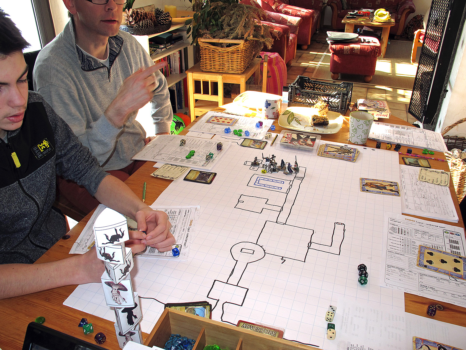 Progressing through the tomb, the pile of defeated enemies is mounting. Savage World gamers will recognise a couple of elements here; the Action Deck as well as the Adventure Deck in use. We use custom character sheets, HeroLab for NPCs and each player has a small quick-reference index card showing standard boni. We found that they were forgetting the knight’s Command edge, for example, so they’ve noted on these cards that they all have +1 on Shaken rolls.